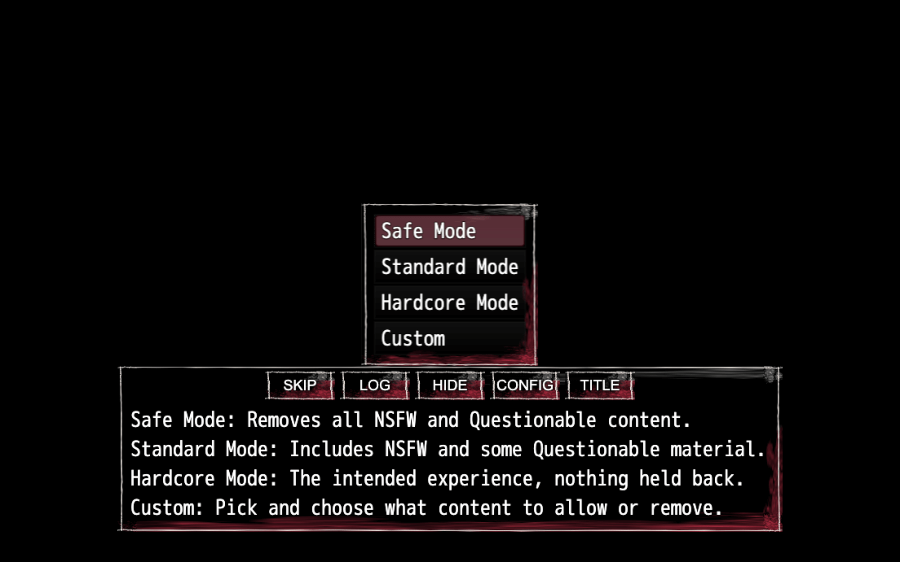 In regards to the different modes, Standard generally contains material that would be deemed consensual on some level. So as an example, the camp sign events would be enabled in full on a Standard mode playthrough. Hardcore mode then adds in sequences that involve nonconsensual actions. So a sequence like how you can have the Drunkard catch Red when she's stuck in the hole. Hardcore mode also contains things the bladder mechanic that a lot of people aren't really into. And of course, in custom you can enable and disable content for a tailor-made experience.