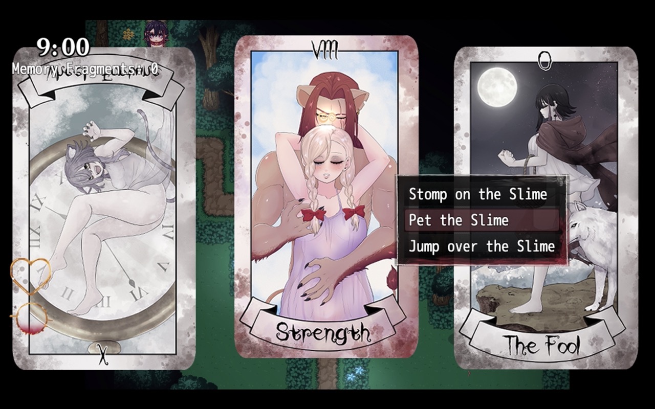 Choice Card scenes have seen a massive QOL update as well. Prior builds forced you to select a card without any idea of what it did or meant, just to get that information, making you click each card just to understand all your options. Now everything is clearly displayed on screen at once. Each card is tied to an action and for some extra goodness it is also fully mouse supported. Hover over te text window or the cards themselves and watch them react to your movement.