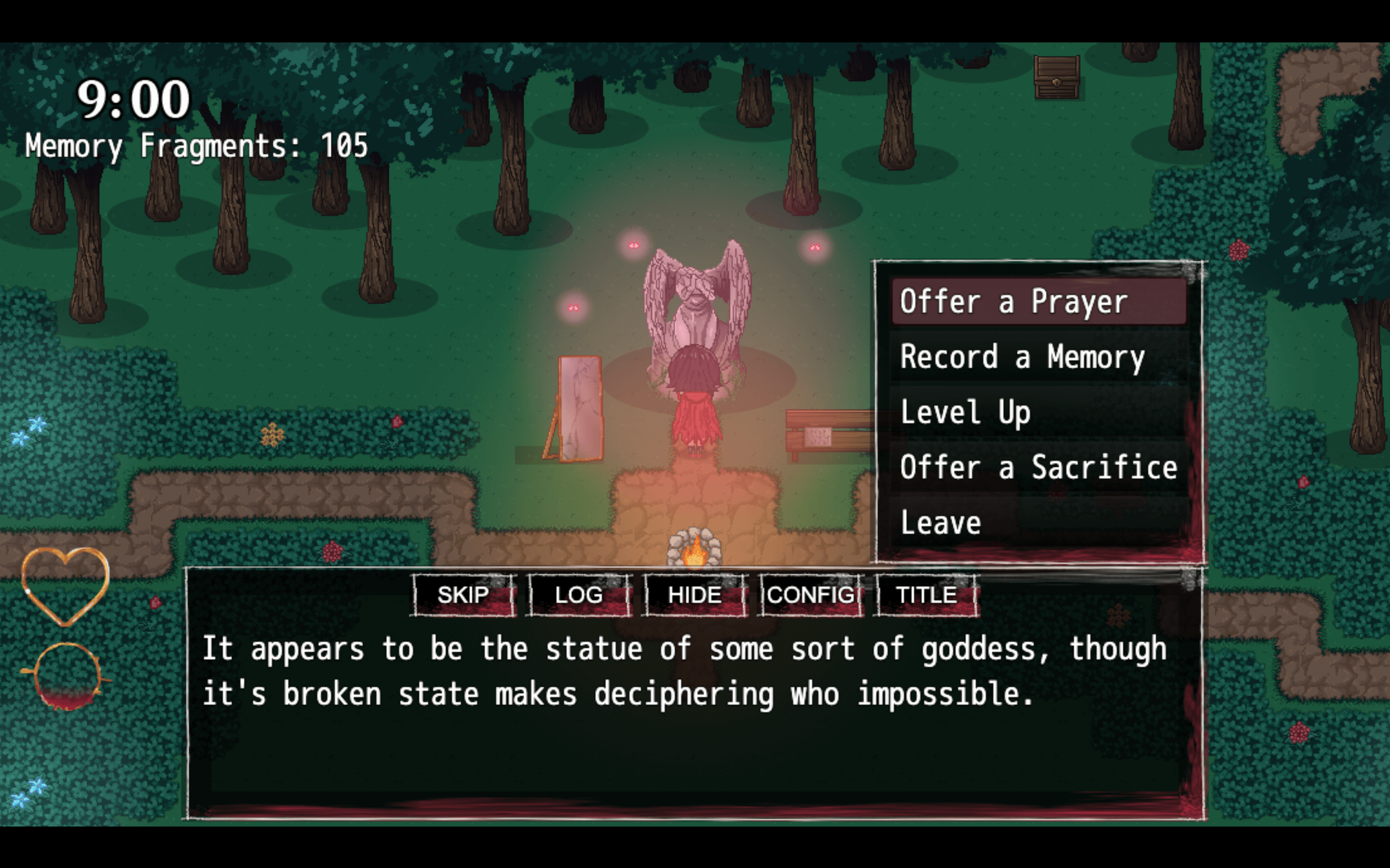 As for the Goddess Statues, the statuses related to Offer a Sacrifice do still exist. And to reveal another QOL update this build lets you hover the mouse over status affects you or an enemy has to display their name, which is a start. Later I will add full on descriptions for what everything does. But to answer what the statuses do, basically you have a percent chance of either entering "Seeing Red" or "Blessing of the Goddess." Seeing Red makes Red act out of control for 2 turns, but has her do 2 normal attacks instead of one. While the Blessing gives you a brief period where HP, MP and ST regenerate and you have boosted resistances to most status effects as well as an MP cost reduction. But the effect expires after walking a certain number of steps. Regardless you also gain an affinity bonus with Ichor though which blessing she gives you is of course up to her whimsy.
