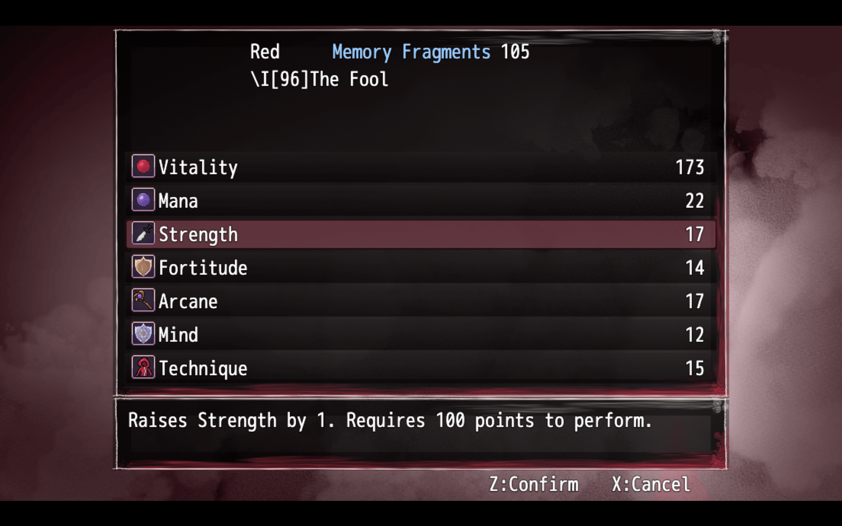 Level Up! Selecting Level Up at the Goddess Statue will take you to a new screen were you can spend Memory Fragments on boosting Red's basic attributes. What are Memory Fragments? New drops that you can get from defeating enemies. While Red's stats naturally increase as she levels up, each Soul starts at level one. Make sure you spend your Memory Fragments to keep your stats up and cover the weaknesses of your Souls. Or double down on one play style and just stick with that. You do you.