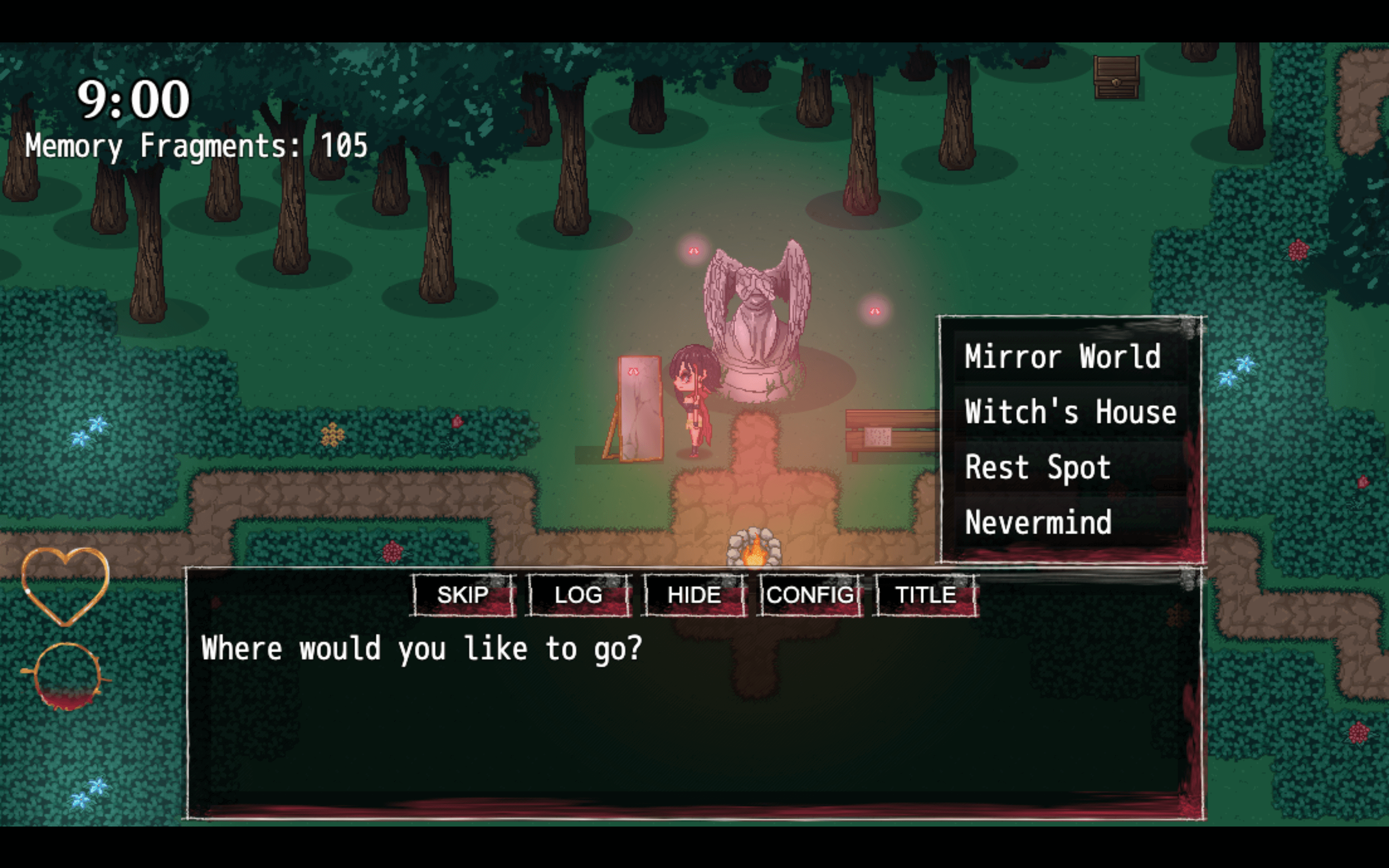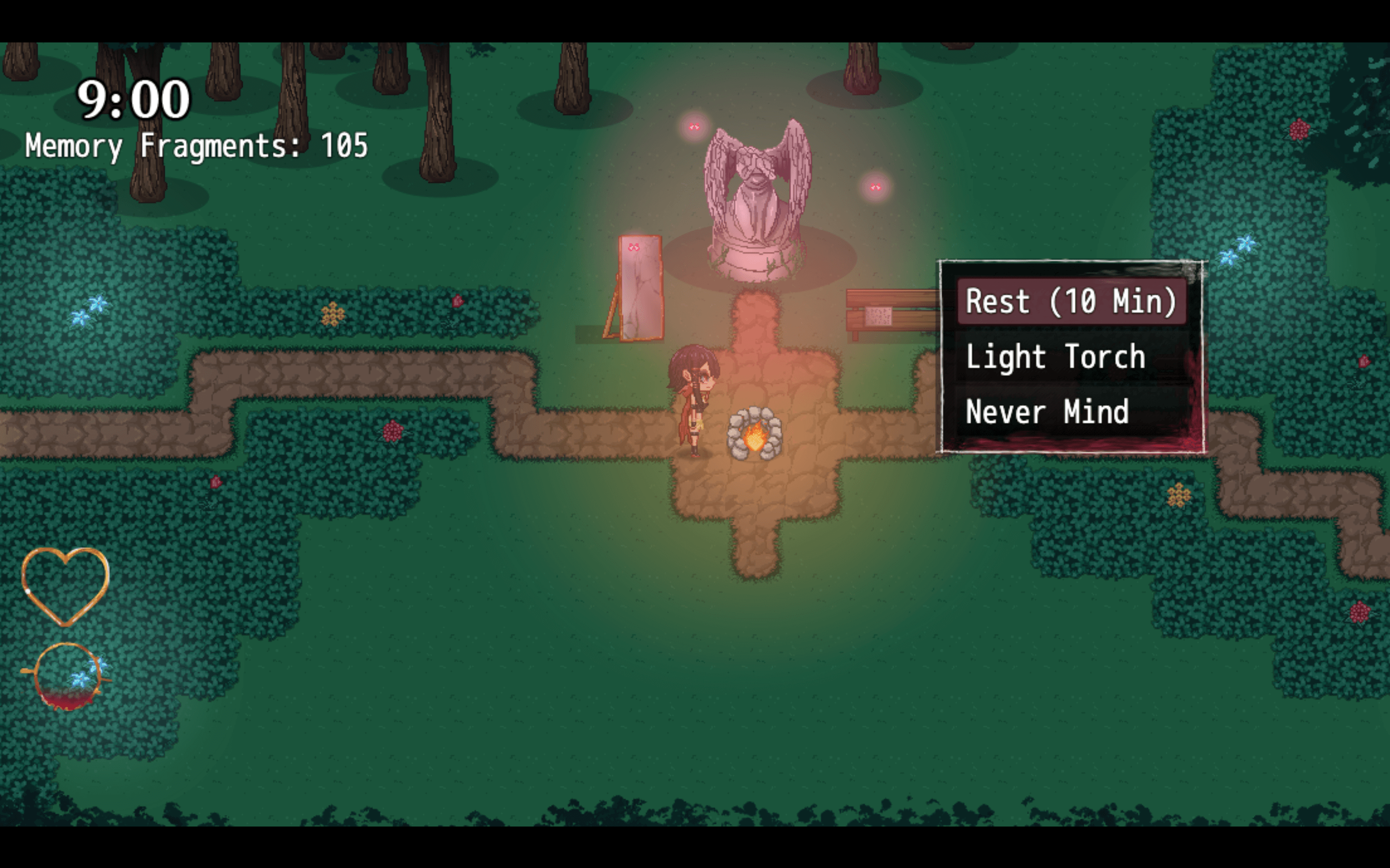 Camp Fires have seen a minor update. Resting now costs 10 minutes instead of 30 and no longer gives you the option to save as it's no longer needed. However Resting now serves two purposes.. 1. It heals Red, of course. 2. It causes enemies to repopulate the forest. So you have choices you can make here. Want to grind exp for a new soul? More power to you. Want to just leave enemies dead forever? You can do that as well. Play the game however you like.